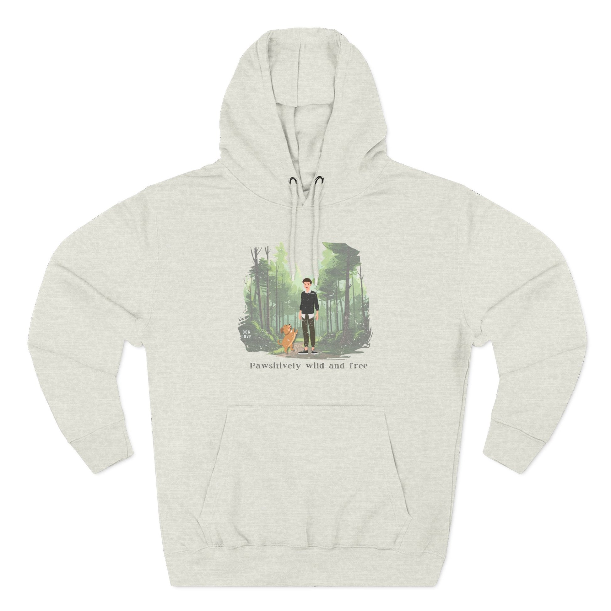 For the dog dads, outdoor explorers, and weekend wanderers—this hoodie captures the bond between man and pup in the wild. Set against a serene forest backdrop, the design features a peaceful hike moment with the quote: “Pawsitively wild and free.”